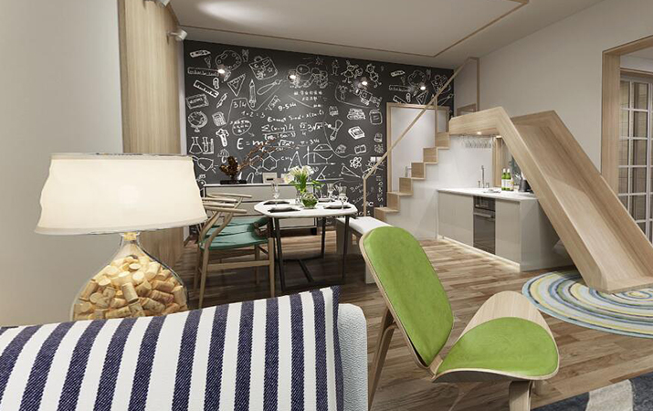 由于业主不一定在珠海定居,传家装饰的设计主要满足基础功能,同时融入业主的兴趣爱好。夫妻二人童心未泯,很想家里有个大的玩具,闲时可以享受童趣。一开始提议秋千,但是这需要很大的空间,被设计师否定。几经沟通,设计师将滑梯搬进了室内。
