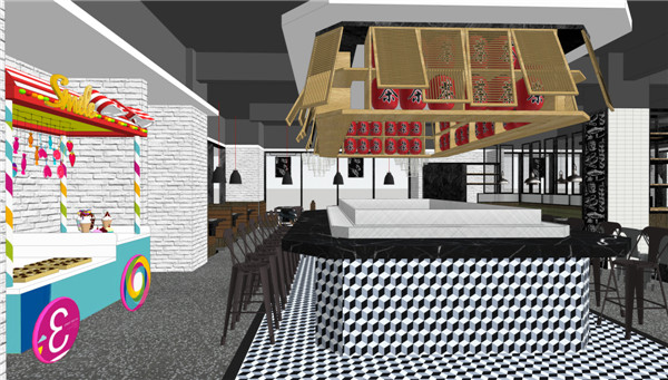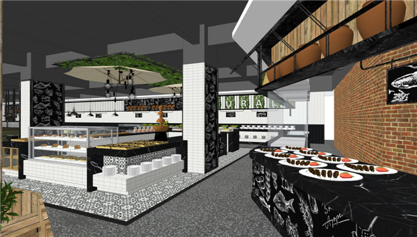 传家团队了解到,项目位于江门又一城商圈,周边有几所学校,主要消费群是学生及本土居民,大多数人对自助餐厅认知依然停留在传统模式,当地也没有一个舒适、个性化的环境适合年轻群体消费,于是针对年轻人和居民家庭消费需求,传家装饰团队将餐厅定位为:一个轻松、时尚、包容性极强的空间。打造出一个别具一格又不失温馨的国际美食自助餐厅。