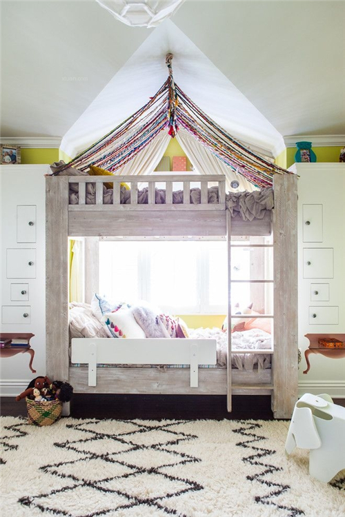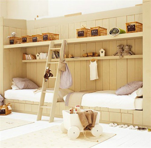 这种装修适合大空间的房间。如果两个小孩年龄比较接近,平行摆放不但有助于孩子有更多的面对面接触,共同分享增进感情,而且也让孩子觉得他们是平等的,父母没有偏袒任何一方。(孩子们有时候非常在意这一点的哦)