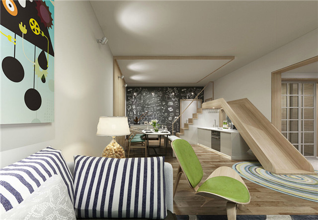 以明快的风格为音符,跳跃于充满逗趣的空间里,是这里最为显著的特点。夫妇俩童心未泯,因此设计师加入滑梯,让他们拾回孩提的纯真。而由于现有厨房太小,H小姐又热爱烘焙及西餐,因此传家设计师在滑梯下方增设了独立西厨,在每一个普通又珍贵的日子里,她将在这里为先生烹饪一道道舌尖上的珍馐。